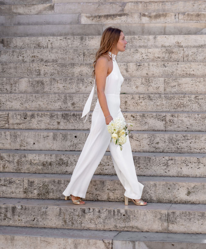 Model Sophie: Combinaison pantalon emmanchure américaine. Une allure moderne et élégante, pensé pour une mariée libre et audacieuse. La soie épouse le corp avec fluidité, offrant confort et raffinement dans le même geste.